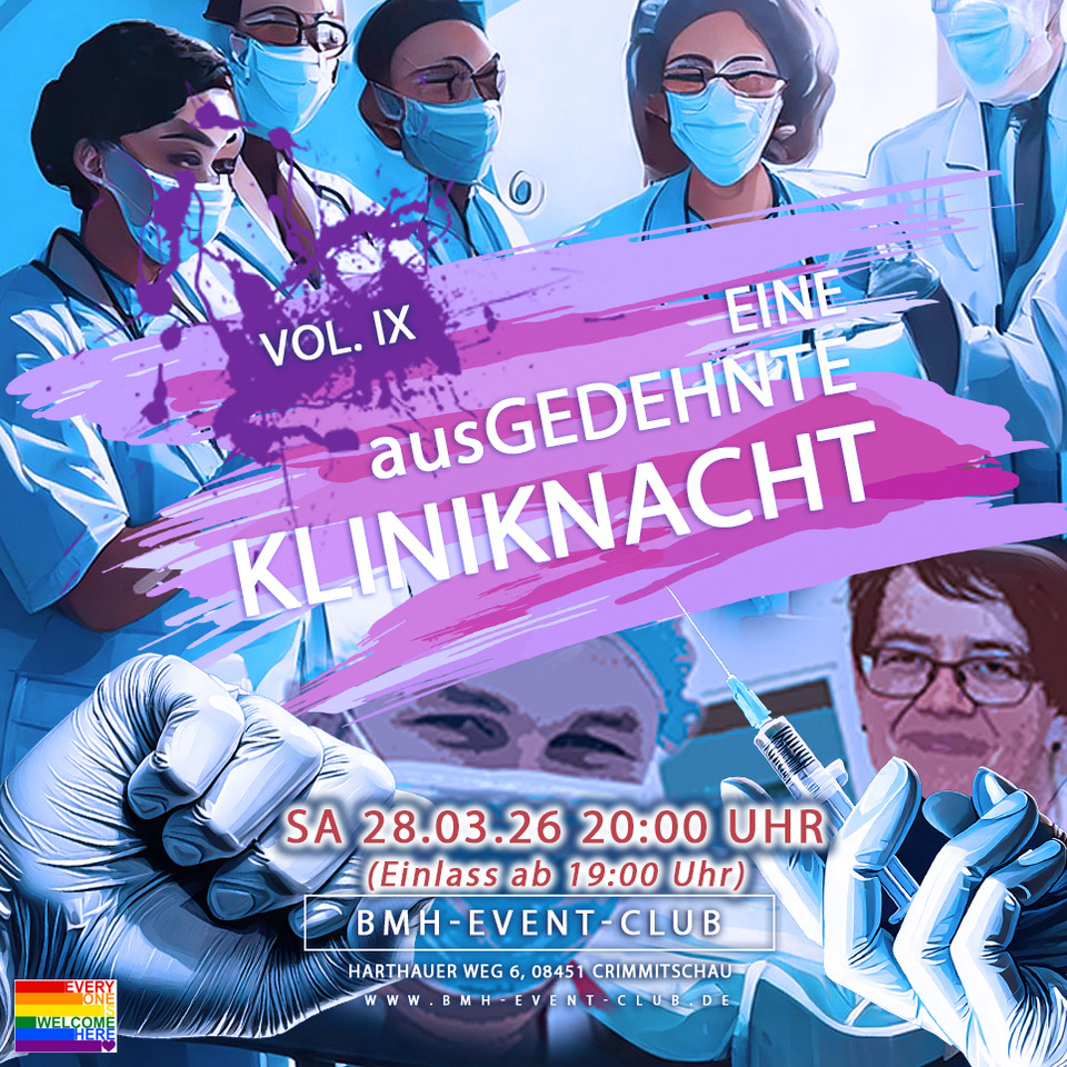 DIE weiße Party der Republik geht jetzt schon in die 9. Runde.Mittlerweile hat es sich herumgesprochen und „Eine ausGEDEHNTE Kliniknacht“ hat sich für Insider zu einer beliebten Anlaufstelle für ganz spezielle Vorlieben entwickelt. Herzlich und ganz verdorben. So soll es sein, so soll es bleiben!